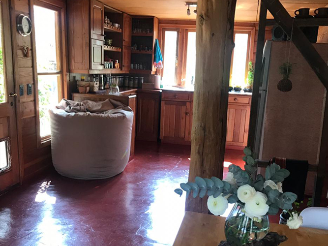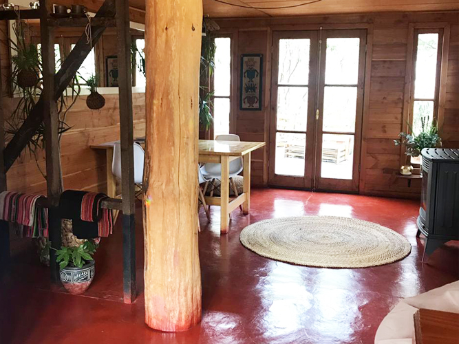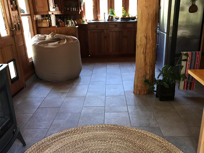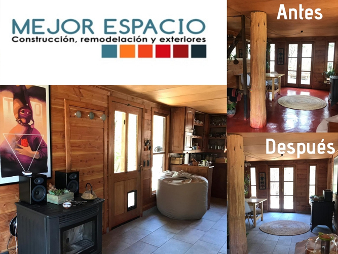 Remodelación piso refugio en Farellones: Se cambió piso de cemento afinado color rojo agrietado por un porcelanato rútisco estilo piedra. La remodelación otorgó mayor luminosidad al espacio, además de facilitar la limpieza.