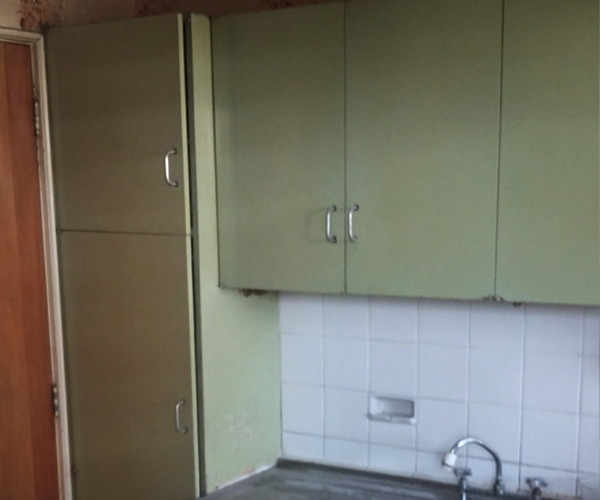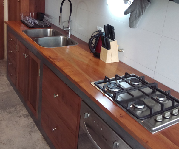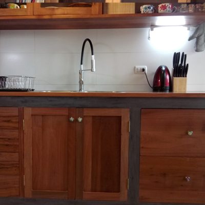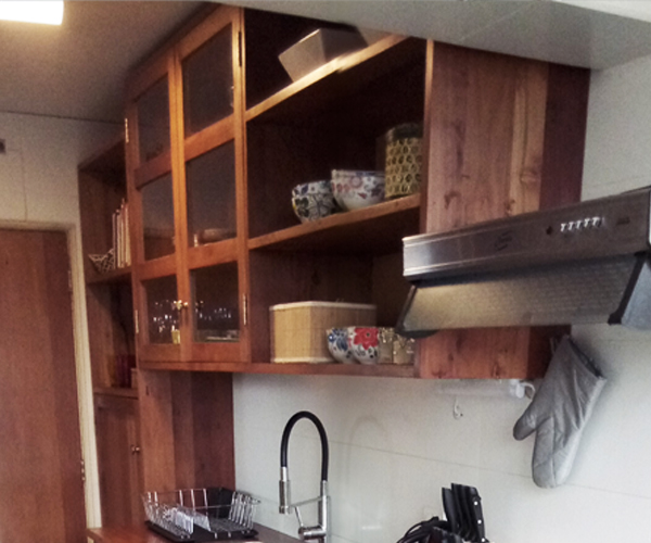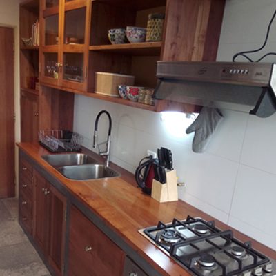 Remodelación de cocina en departamento de comuna de Providencia. Se realizó una intervención completa a la cocina. Se retiraron muebles, piso y muros. Se revistieron los muros y piso con porcelanato. Los muebles fueron reemplazos por muebles revestidos con micro cemento y mesones de roble.