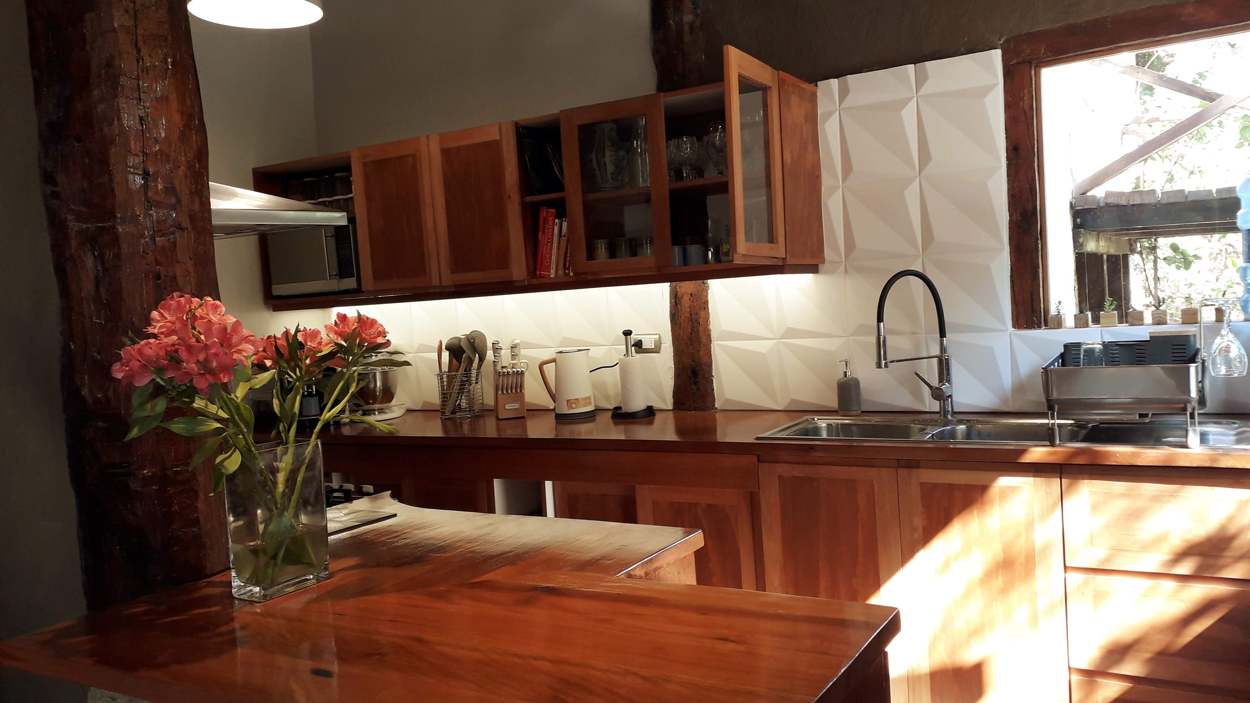 Remodelación completa de cocina para cliente en Peñalolén. Cambió cerámicos, sistema eléctrico, artefactos y muebles de cocina en roble.